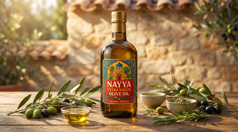 This project presents a collage showcasing Nayya Imports' olive oil products. It includes images of bottles of Nayya olive oil on display tables, marble surfaces, and rustic tables.